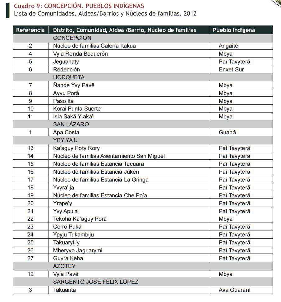 No mapa abaixo podemos ver as comunidades indígenas do departamento de Concepción. As que estão marcadas em azul claro pertencem à etnia Guaraní Mbyá, as marcadas em verde, à etnia Paî-Tavyterá, e em marrom ao grupo Avá Guarani. Estes três povos pertencem à família linguística Guaraní. Há também comunidades de outras famílias linguísticas neste departamento, como podemos ver na legenda. Para ampliar, clique sobre o mapa, que será aberto uma nova aba. De acordo com o III CENSO NACIONAL DE POBLACIÓN Y VIVIENDAS PARA PUEBLOS INDÍGENAS, nenhuma das comunidades indígenas listadas abaixo recebe, conforme o termo utilizado no censo, 'assistência religiosa' da parte de missionários evangélicos.