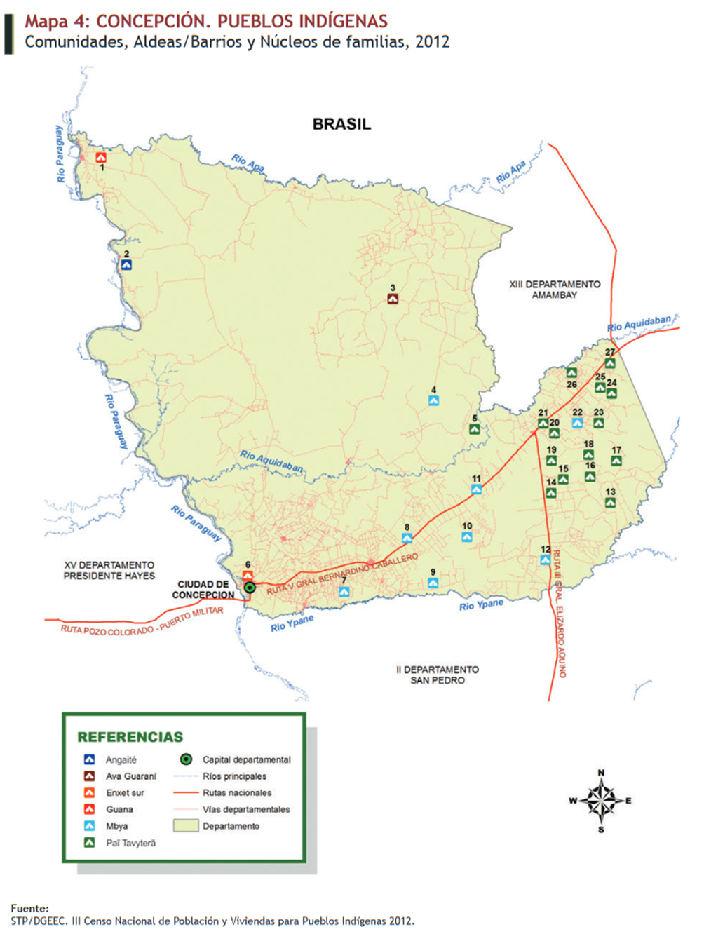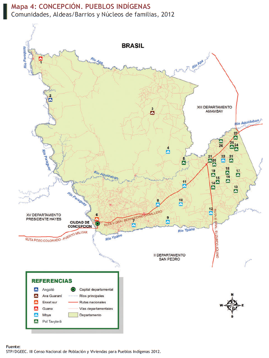 No mapa abaixo podemos ver as comunidades indígenas do departamento de Concepción. As que estão marcadas em azul claro pertencem à etnia Guaraní Mbyá, as marcadas em verde, à etnia Paî-Tavyterá, e em marrom ao grupo Avá Guarani. Estes três povos pertencem à família linguística Guaraní. Há também comunidades de outras famílias linguísticas neste departamento, como podemos ver na legenda. Para ampliar, clique sobre o mapa, que será aberto uma nova aba. De acordo com o III CENSO NACIONAL DE POBLACIÓN Y VIVIENDAS PARA PUEBLOS INDÍGENAS, nenhuma das comunidades indígenas listadas abaixo recebe, conforme o termo utilizado no censo, 'assistência religiosa' da parte de missionários evangélicos.